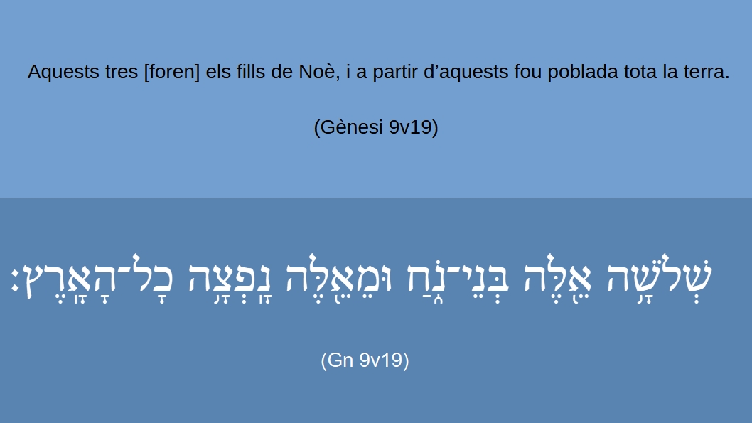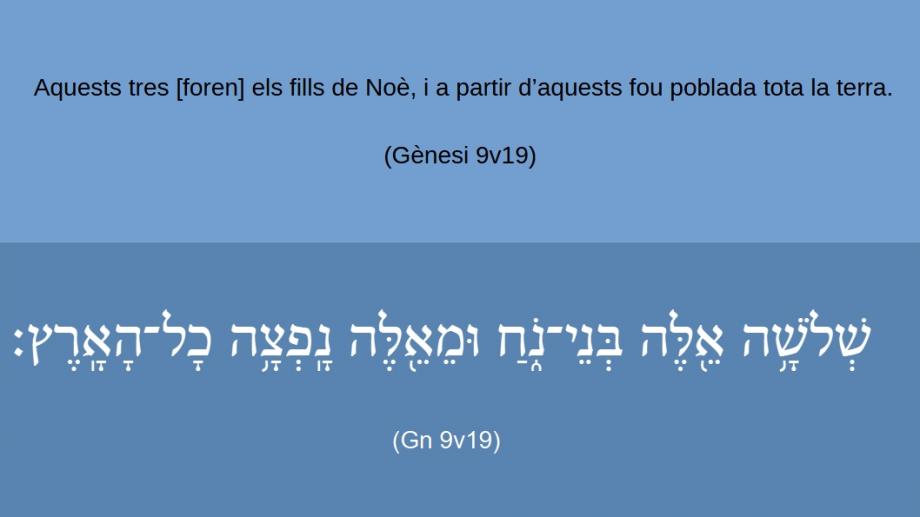 Gènesi 9v19 Aquests tres [foren] els fills de Noè, i a partir d’aquests fou poblada tota la terra.שְׁלֹשָׁ֥הֿ אֵ֖לֶּהֿ בְּנֵי־נֹ֑חַ וּמֵאֵ֖לֶּהֿ נָֽפְֿצָ֥הֿ כָֿל־הָאָֽרֶץ׃ (Gn 9v19) שְׁלֹשָׁ֥הֿ אֵ֖לֶּהֿ בְּנֵי־נֹ֑חַ וּמֵאֵ֖לֶּהֿ נָֽפְֿצָ֥הֿ כָֿל־הָאָֽרֶץ׃ (Gn 9v19)