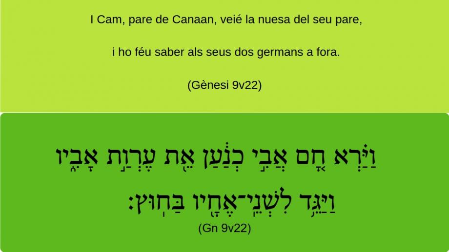 Gènesi 9v22 I Cam, pare de Canaan, veié la nuesa del seu pare, i ho féu saber als seus dos germans a fora. וַיַּ֗רְא חָ֚ם אֲבִֿ֣י כְֿנַ֔עַן אֵ֖תֿ עֶרְוַ֣תֿ אָבִֿ֑יו וַיַּגֵּ֥דֿ לִשְׁנֵֽי־אֶחָ֖יו בַּחֽוּץ׃ (Gn 9v22)