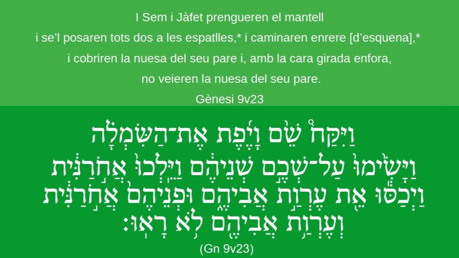 Gènesi 9v23 I Sem i Jàfet prengueren el mantell i se’l posaren tots dos a les espatlles,* i caminaren enrere [d’esquena],* i cobriren la nuesa del seu pare i, amb la cara girada enfora, no veieren la nuesa del seu pare.וַיִּקַּח֩ שֵׁ֨ם וָיֶ֜פֶֿתֿ אֶתֿ־הַשִּׂמְלָ֗הֿ וַיָּשִׂ֙ימוּ֙ עַל־שְׁכֶֿ֣ם שְׁנֵיהֶ֔ם וַיֵּֽלְכֿוּ֙ אֲחֹ֣רַנִּ֔יתֿ וַיְכַֿסּ֕וּ אֵ֖תֿ עֶרְוַ֣תֿ אֲבִֿיהֶ֑ם וּפְֿנֵיהֶם֙ אֲחֹ֣רַנִּ֔יתֿ וְעֶרְוַ֥תֿ אֲבִֿיהֶ֖ם לֹ֥א רָאֽוּ׃ (Gn 9v23)