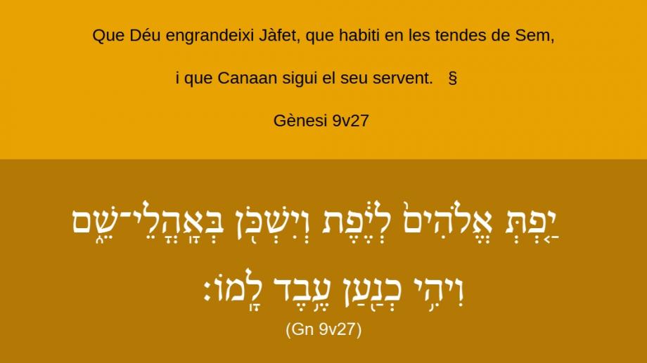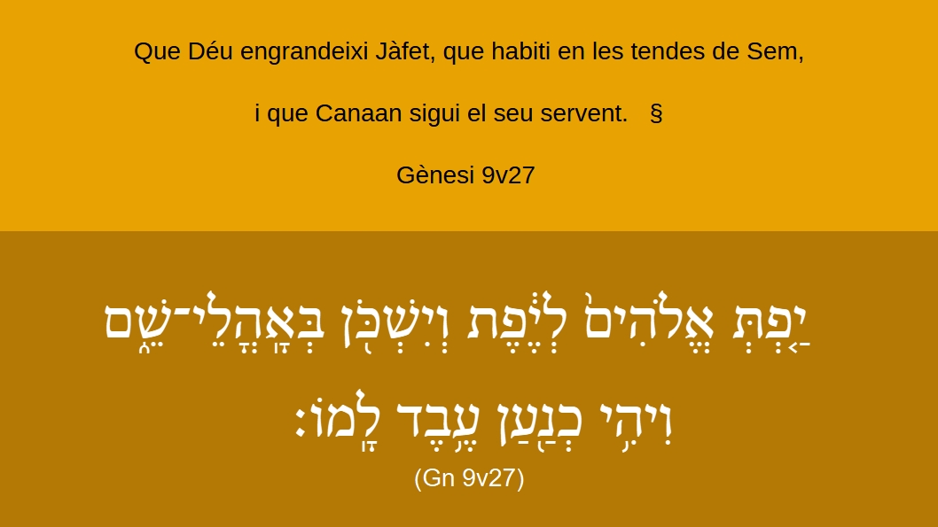 Gènesi 9v27 Que Déu engrandeixi Jàfet, que habiti en les tendes de Sem, i que Canaan sigui el seu servent.   §   ¶   {יַ֤פְֿתְּ אֱלֹהִים֙ לְיֶ֔פֶֿתֿ וְיִשְׁכֹּ֖ן בְּאָֽהֳלֵי־שֵׁ֑ם וִיהִ֥י כְֿנַ֖עַן עֶ֥בֶֿדֿ לָֽמוֹ׃   (Gn 9v27)   §   ¶   {