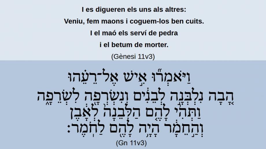 Gènesi 11v1 I tota la terra era d’una sola llengua i d’uns mateixos mots.וַיְהִ֥י כָֿל־הָאָ֖רֶץ שָׂפָֿ֣הֿ אֶחָ֑תֿ וּדְֿבָֿרִ֖ים אֲחָדִֽֿים׃    (Gn 11v1) Gènesi 11v2 I s’esdevingué que marxaren de l’orient, i trobaren una plana a la terra de Xinar, i s’hi establiren.וַיְהִ֖י בְּנָסְעָ֣ם מִקֶּ֑דֶֿם וַיִּמְצְא֥וּ בִֿקְעָ֛הֿ בְּאֶ֥רֶץ שִׁנְעָ֖ר וַיֵּ֥שְׁבֿוּ שָֽׁם׃   (Gn 11v2) Gènesi 11v3 I es digueren els uns als altres: Veniu, fem maons i coguem-los ben cuits. I el maó els serví de pedra i el betum de morter.וַיֹּֽאֿמְר֞וּ אִ֣ישׁ אֶל־רֵעֵ֗הוּ הָ֚בָֿהֿ נִלְבְּנָ֣הֿ לְבֵֿנִ֔ים וְנִשְׂרְפָֿ֖הֿ לִשְׂרֵפָֿ֑הֿ וַתְּהִ֨י לָהֶ֤ם הַלְּבֵֿנָה֙ לְאָ֔בֶֿן וְהַ֣חֵמָ֔ר הָיָ֥הֿ לָהֶ֖ם לַחֹֽמֶר׃   (Gn 11v3) Gènesi 11v4 I digueren: Veniu, edifiquem-nos una ciutat i una torre amb el seu cim en els cels, i fem-nos un nom a fi que no siguem dispersats per sobre la superfície de tota la terra.וַיֹּֽאֿמְר֞וּ הָ֣בָֿהֿ׀ נִבְֿנֶהֿ־לָּ֣נוּ עִ֗יר וּמִגְֿדָּל֙ וְרֹאֿשׁ֣וֹ בַֿשָּׁמַ֔יִם וְנַֽעֲשֶׂהֿ־לָּ֖נוּ שֵׁ֑ם פֶּן־נָפֿ֖וּץ עַל־פְּנֵ֥י כָֿל־הָאָֽרֶץ׃   (Gn 11v4) וַיֹּֽאֿמְר֞וּ הָ֣בָֿהֿ׀ נִבְֿנֶהֿ־לָּ֣נוּ עִ֗יר וּמִגְֿדָּל֙ וְרֹאֿשׁ֣וֹ בַֿשָּׁמַ֔יִם וְנַֽעֲשֶׂהֿ־לָּ֖נוּ שֵׁ֑ם פֶּן־נָפֿ֖וּץ עַל־פְּנֵ֥י כָֿל־הָאָֽרֶץ׃   (Gn 11v4) Gènesi 11v5 I Jahveh baixà per veure la ciutat i la torre que els fills dels homes edificaven.וַיֵּ֣רֶדֿ יְהֹוָ֔ה לִרְאֹ֥תֿ אֶתֿ־הָעִ֖יר וְאֶתֿ־הַמִּגְֿדָּ֑ל אֲשֶׁ֥ר בָּנ֖וּ בְּנֵ֥י הָֽאָדָֽֿם׃   (Gn 11v5) Gènesi 11v6 I Jahveh digué: Heus aquí, són un sol poble i tots tenen una sola llengua; i això és el que comencen a fer, i ara res no els impedirà de fer el que s’han proposat.וַיֹּ֣אֿמֶר יְהֹוָ֗ה הֵ֣ן עַ֤ם אֶחָד֙ וְשָׂפָֿ֤הֿ אַחַת֙ לְכֻֿלָּ֔ם וְזֶ֖הֿ הַֽחִלָּ֣ם לַֿעֲשׂ֑וֹתֿ וְעַתָּה֙ לֹֽא־יִבָּצֵ֣ר מֵהֶ֔ם כֹּ֛ל אֲשֶׁ֥ר יָֽזְמ֖וּ לַֽעֲשֽׂוֹתֿ׃   (Gn 11v6) Gènesi 11v7 Veniu, baixem i confonguem allà la seva llengua, a fi que ningú no entengui la llengua dels altres.הָ֚בָֿהֿ נֵֽרְדָ֔הֿ וְנָֽבְֿלָ֥הֿ שָׁ֖ם שְׂפָֿתָֿ֑ם אֲשֶׁר֙ לֹ֣א יִשְׁמְע֔וּ אִ֖ישׁ שְׂפַֿ֥תֿ רֵעֵֽהוּ׃   (Gn 11v7) Gènesi 11v8 I Jahveh els dispersà d’allà per damunt la superfície de tota la terra, i deixaren d’edificar la ciutat.וַיָּ֨פֶֿץ יְהֹוָ֥ה אֹתָֿ֛ם מִשָּׁ֖ם עַל־פְּנֵ֣י כָֿל־הָאָ֑רֶץ וַֽיַּחְדְּל֖וּ לִבְֿנֹ֥תֿ הָעִֽיר׃   (Gn 11v8) Gènesi 11v9 Per això el seu nom s’anomena Babel, perquè allà Jahveh va confondre la llengua de tota la terra, i d’allà Jahveh els dispersà sobre tota la superfície de la terra.              §   ¶   {עַל־כֵּ֞ן קָרָ֤א שְׁמָהּ֙ בָּבֶ֔ל כִּי־שָׁ֛ם בָּלַ֥ל יְהֹוָ֖ה שְׂפַֿ֣תֿ כָּל־הָאָ֑רֶץ וּמִשָּׁם֙ הֱפִֿיצָ֣ם יְהֹוָ֔ה עַל־פְּנֵ֖י כָּל־הָאָֽרֶץ׃פ   (Gn 11v9) עַל־כֵּ֞ן קָרָ֤א שְׁמָהּ֙ בָּבֶ֔ל כִּי־שָׁ֛ם בָּלַ֥ל יְהֹוָ֖ה שְׂפַֿ֣תֿ כָּל־הָאָ֑רֶץ וּמִשָּׁם֙ הֱפִֿיצָ֣ם יְהֹוָ֔ה עַל־פְּנֵ֖י כָּל־הָאָֽרֶץ׃פ   (Gn 11v9)   §   ¶   {  {reduplica...} עַל־כֵּ֞ן קָרָ֤א שְׁמָהּ֙ בָּבֶ֔ל כִּי־שָׁ֛ם בָּלַ֥ל יְהֹוָ֖ה שְׂפַֿ֣תֿ כָּל־הָאָ֑רֶץ וּמִשָּׁם֙ הֱפִֿיצָ֣ם יְהֹוָ֔ה עַל־פְּנֵ֖י כָּל־הָאָֽרֶץ׃פ   (Gn 11v9) עַל־כֵּ֞ן קָרָ֤א שְׁמָהּ֙ בָּבֶ֔ל כִּי־שָׁ֛ם בָּלַ֥ל יְהֹוָ֖ה שְׂפַֿ֣תֿ כָּל־הָאָ֑רֶץ וּמִשָּׁם֙ הֱפִֿיצָ֣ם יְהֹוָ֔ה עַל־פְּנֵ֖י כָּל־הָאָֽרֶץ׃פ   (Gn 11v9)   §   ¶   {  {reduplica...} Gènesi 11v10 Aquestes són les generacions de Sem: Sem [tenia] cent anys quan engendrà Arfaxad, dos anys després del diluvi.אֵ֚לֶּהֿ תּֽוֹלְדֹֿ֣תֿ שֵׁ֔ם שֵׁ֚ם בֶּן־מְאַ֣תֿ שָׁנָ֔הֿ וַיּ֖וֹלֶדֿ אֶתֿ־אַרְפַּכְֿשָׁ֑דֿ שְׁנָתַֿ֖יִם אַחַ֥ר הַמַּבּֽוּל׃   (Gn 11v10)   § Gènesi 11v11 I Sem, després d’haver engendrat Arfaxad, visqué cinc-cents anys, i engendrà fills i filles.וַֽיְחִי־שֵׁ֗ם אַֽחֲרֵי֙ הֽוֹלִידֿ֣וֹ אֶתֿ־אַרְפַּכְֿשָׁ֔דֿ חֲמֵ֥שׁ מֵא֖וֹתֿ שָׁנָ֑הֿ וַיּ֥וֹלֶדֿ בָּנִ֖ים וּבָֿנֽוֹתֿ׃ס    (Gn 11v11) Gènesi 11v12 I Arfaxad visqué trenta-cinc anys, i engendrà Salà.וְאַרְפַּכְֿשַׁ֣דֿ חַ֔י חָמֵ֥שׁ וּשְׁלֹשִׁ֖ים שָׁנָ֑הֿ וַיּ֖וֹלֶדֿ אֶתֿ־שָֽׁלַח׃   (Gn 11v12)   { Gènesi 11v13 I Arfaxad, després d’haver engendrat Salà, visqué quatre-cents tres anys, i engendrà fills i filles.   §   ¶   {וַיְחִ֣י אַרְפַּכְֿשַׁ֗דֿ אַֽחֲרֵי֙ 