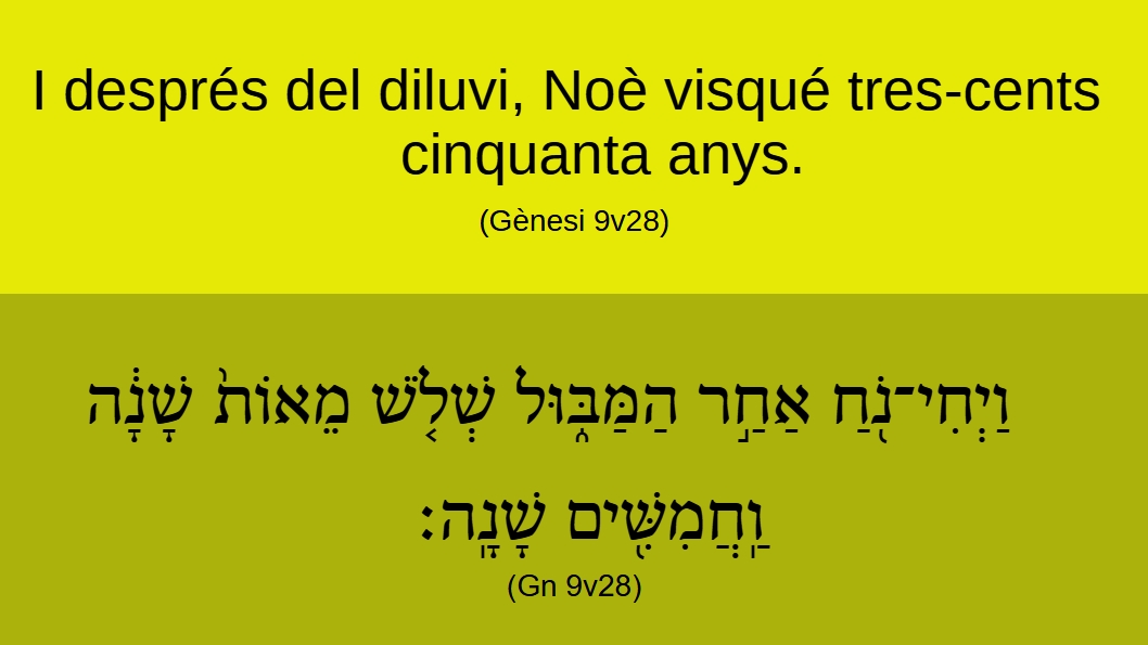 Gènesi 9v28 I després del diluvi,* Noè visqué tres-cents cinquanta anys.וַֽיְחִי־נֹ֖חַ אַחַ֣ר הַמַּבּ֑וּל שְׁלֹ֤שׁ מֵאוֹת֙ שָׁנָ֔הֿ וַֽחֲמִשִּׁ֖ים שָׁנָֽהֿ׃ (Gn 9v28) {