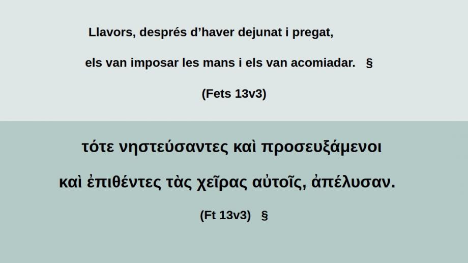 Fets 13v3 Llavors, després d’haver dejunat i pregat, els van imposar les mans i els van acomiadar. § τότε νηστεύσαντες καὶ προσευξάμενοι καὶ ἐπιθέντες τὰς χεῖρας αὐτοῖς, ἀπέλυσαν. (Ft 13v3) §