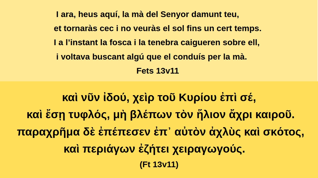 Fets 13v11 I ara, heus aquí, la mà del Senyor damunt teu, et tornaràs cec i no veuràs el sol fins un cert temps. I a l’instant la fosca i la tenebra caigueren sobre ell, i voltava buscant algú que el conduís per la mà.καὶ νῦν ἰδού, χεὶρ τοῦ Κυρίου ἐπὶ σέ, καὶ ἔσῃ τυφλός, μὴ βλέπων τὸν ἥλιον ἄχρι καιροῦ. παραχρῆμα δὲ ἐπέπεσεν ἐπ᾽ αὐτὸν ἀχλὺς καὶ σκότος, καὶ περιάγων ἐζήτει χειραγωγούς. (Ft 13v11)
