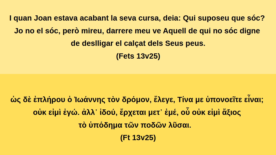 Fets 13v25 I quan Joan estava acabant la seva cursa, deia: Qui suposeu que sóc? Jo no el sóc, però mireu, darrere meu ve Aquell de qui no sóc digne de deslligar el calçat dels Seus peus.ὡς δὲ ἐπλήρου ὁ Ἰωάννης τὸν δρόμον, ἔλεγε, Τίνα με ὑπονοεῖτε εἶναι; οὐκ εἰμὶ ἐγώ. ἀλλ᾽ ἰδού, ἔρχεται μετ᾽ ἐμέ, οὗ οὐκ εἰμὶ ἄξιος τὸ ὑπόδημα τῶν ποδῶν λῦσαι. (Ft 13v25)