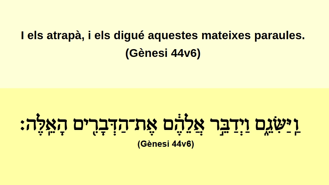Data: 2026-04-06, dillunsComentari: Gènesi 44v6 I els atrapà, i els digué aquestes mateixes paraules.וַיַּשִּׂגֵֿ֑ם וַיְדַֿבֵּ֣ר אֲלֵהֶ֔ם אֶתֿ־הַדְּבָֿרִ֖ים הָאֵֽלֶּהֿ׃ (Gn 44v6)