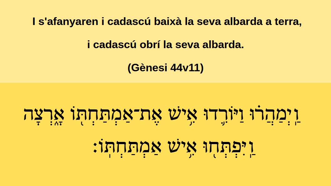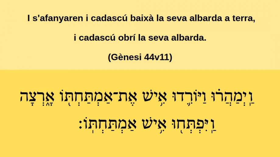 Gènesi 44v11 I s'afanyaren i cadascú baixà la seva albarda a terra, i cadascú obrí la seva albarda.ֽוַיְמַֽהֲר֗וּ וַיּוֹרִ֛דֿוּ אִ֥ישׁ אֶתֿ־אַמְתַּחְתּ֖וֹ אָ֑רְצָהֿ וַֽיִּפְֿתְּח֖וּ אִ֥ישׁ אַמְתַּחְתּֽוֹ׃ (Gn 44v11)