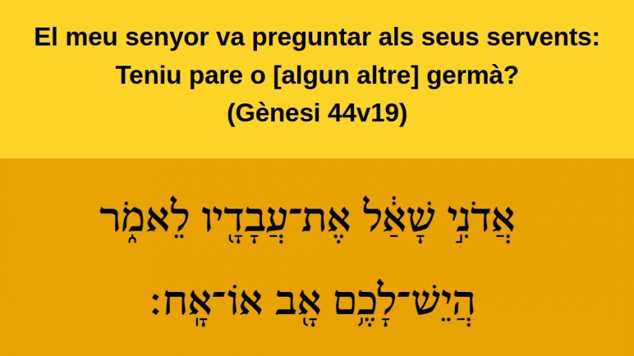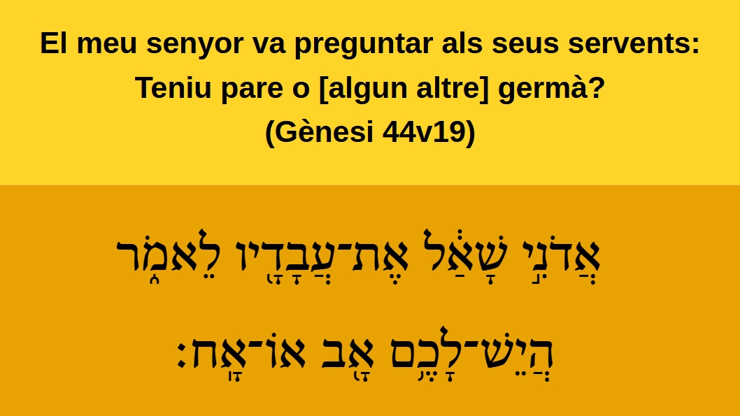 Gènesi 44v19 El meu senyor va preguntar als seus servents: Teniu pare o [algun altre] germà? אֲדֹֿנִ֣י שָׁאַ֔ל אֶתֿ־עֲבָֿדָֿ֖יו לֵאֿמֹ֑ר הֲיֵשׁ־לָכֶֿ֥ם אָ֖בֿ אוֹ־אָֽח׃ (Gn 44v19)